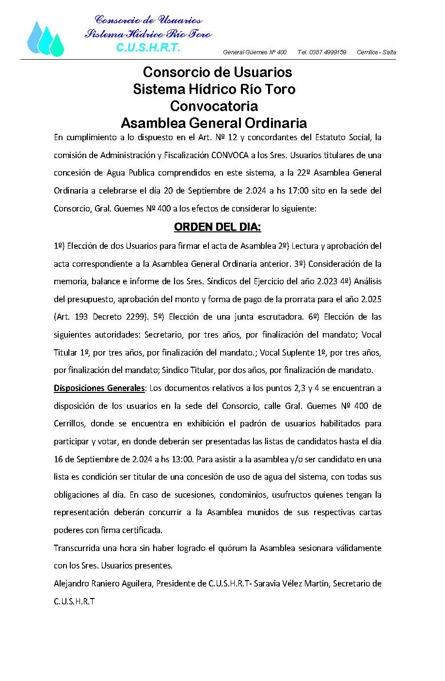 El Consorcio de Usuarios del Sistema Hídrico Río Toro (C.U.S.H.R.T.) convoca a todos los usuarios titulares de concesiones de agua pública a la 22º Asamblea General Ordinaria, que se llevará a cabo el próximo 20 de septiembre de 2024, a las 17:00 horas, en la sede del Consorcio, ubicada en General Güemes Nº 400.
