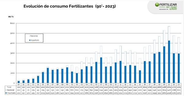 Fertilizar Asociación Civil estimó que el consumo de fertilizantes alcanzó en 2023 las 4.580.000 toneladas. «El dato, aunque refleja una leve caída del 4%, revela también una desaceleración significativa en la tendencia negativa, lo que constituye un punto positivo para el sector, tras una caída más pronunciada, del 16%, en el 2022″, repasa la entidad.
