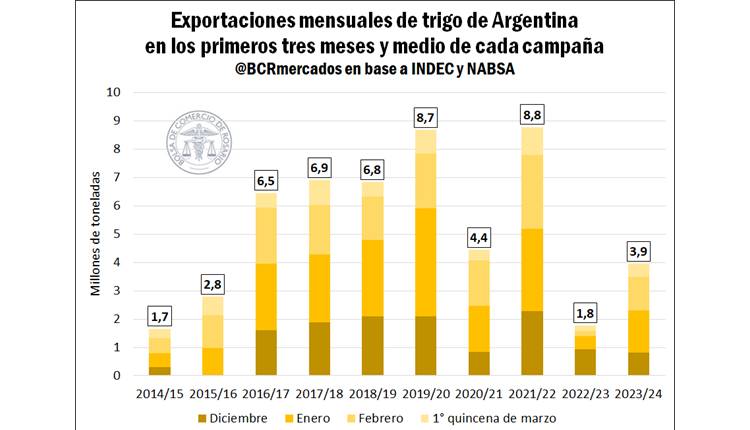 La estimación de la Bolsa de Comercio de Rosario de la cosecha argentina de trigo arrojó 14,5 Mt en el ciclo 2023/24. “Teniendo en cuenta este panorama, los datos provistos por el Instituto Nacional de Estadística y Censos (INDEC) y la Agencia Marítima NABSA S.A. (NABSA) advierten que las exportaciones del cereal en nuestro país desde diciembre a febrero 2024 inclusive ascendieron a 3,5 millones de toneladas. Asimismo, considerando los buques despachados entre el 1 y el 14 de marzo, se advierte que se exportaron poco más de 445.700 toneladas de trigo en lo que va del cuarto mes de la campaña. De esta manera, las exportaciones argentinas de trigo totalizaron 3,9 millones de toneladas”, informó la BCR.