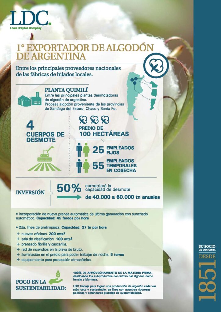 “Nuestra continua inversión en Quimilí representa el compromiso de LDC de aumentar tanto la calidad como la capacidad de nuestros servicios de desmote, al tiempo que facilitamos el acceso a mercados locales y globales para los productores regionales”, dijo Pablo Yezdrich, Head Regional de Algodón de Latinoamérica Sur y Oeste de LDC. “En la década en que LDC ha estado operando la planta, hemos transformado su perfil al producir no solo fibra de algodón sino también subproductos del cultivo como semilla, fibrilla y cascarilla, priorizando siempre la seguridad operativa y la sustentabilidad”.