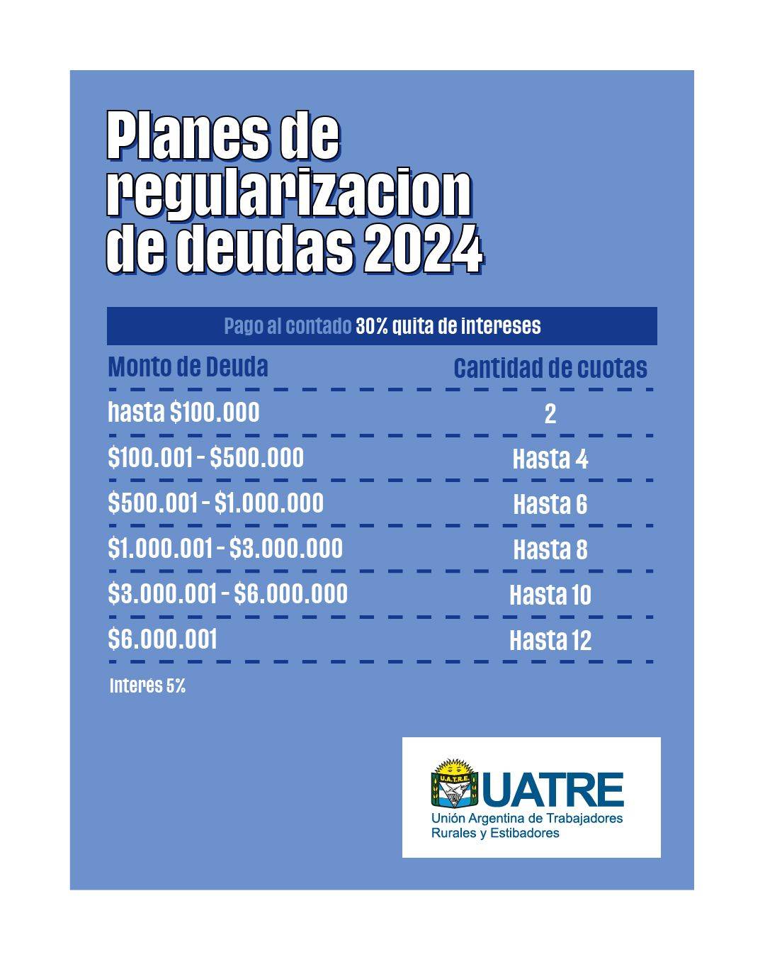 Para conocer el estado de su deuda y acceder a cualquiera de estas alternativas, contáctese al área de Recaudaciones de UATRE al mail: regularizacion@uatre.org.ar