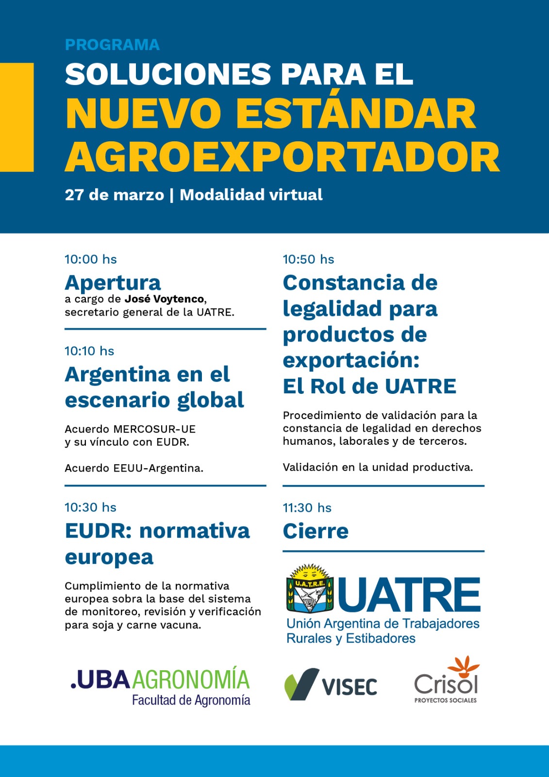 La Unión Argentina de Trabajadores Rurales y Estibadores (UATRE) impulsa una agenda estratégica ante las crecientes exigencias internacionales. El próximo viernes 27 de marzo a las 10 hs, se llevará a cabo el encuentro virtual “Soluciones para el nuevo estándar agroexportador”, un espacio diseñado para debatir cómo el cumplimiento de los derechos laborales se ha convertido en un activo de competitividad para el agro argentino.