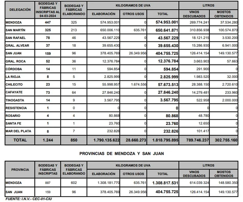 El INV había pronosticado que esta vendimia se iban a cosechar 477.860.000 kilos, un incremento interanual del 16%. El año pasado por causa de la sequía, las olas de calor reiteradas y las heladas tardías; esta provincia tuvo el peor registro de cosecha desde 1954.